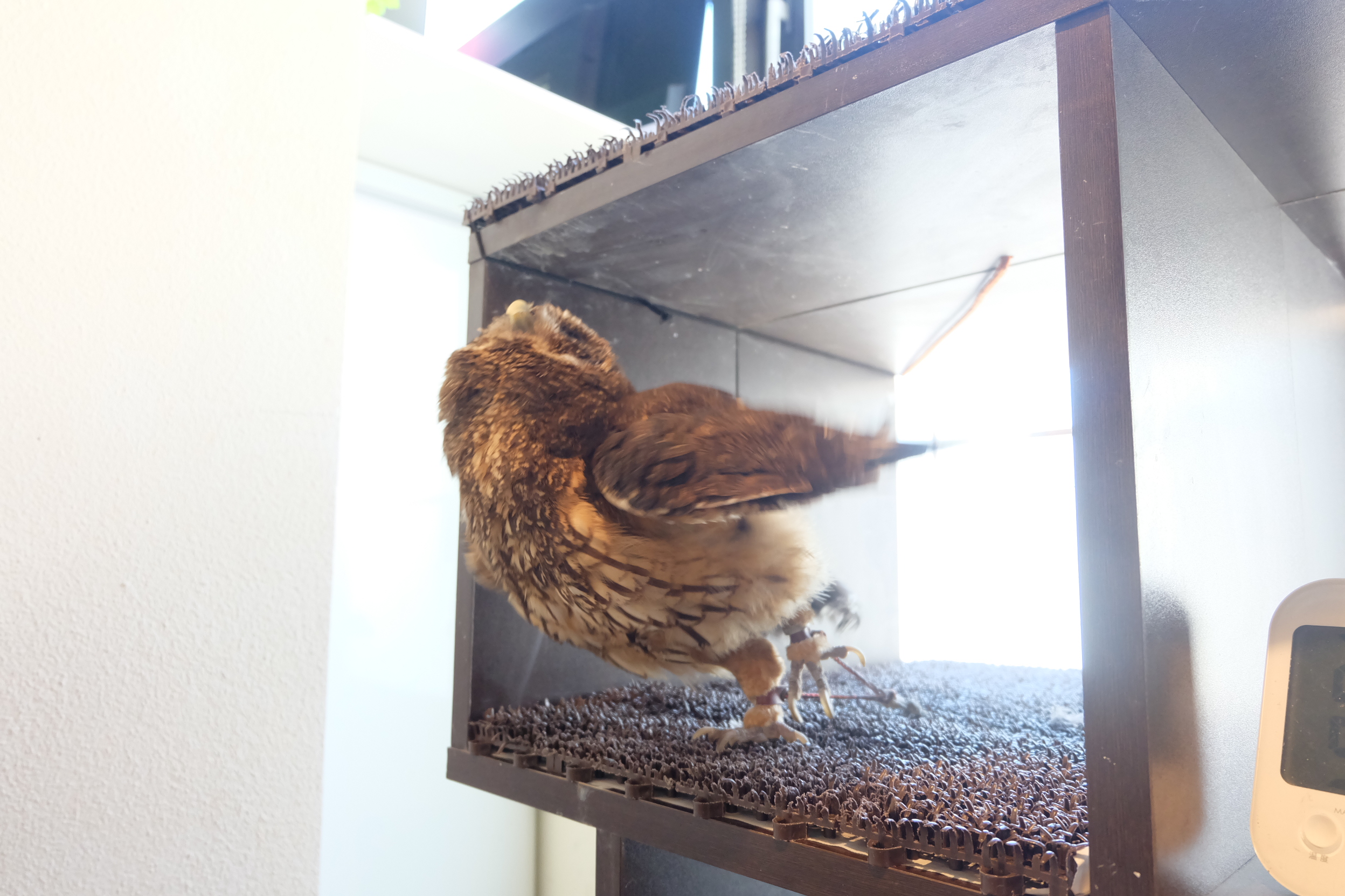 カフェの店員の方とお話ししたところ、その方が言うには、人に見られたり触られたりすることでふくろうたちがストレスを感じるので、少しでも気分転換させるために定期的に外に連れ出してあげるのだそうです。